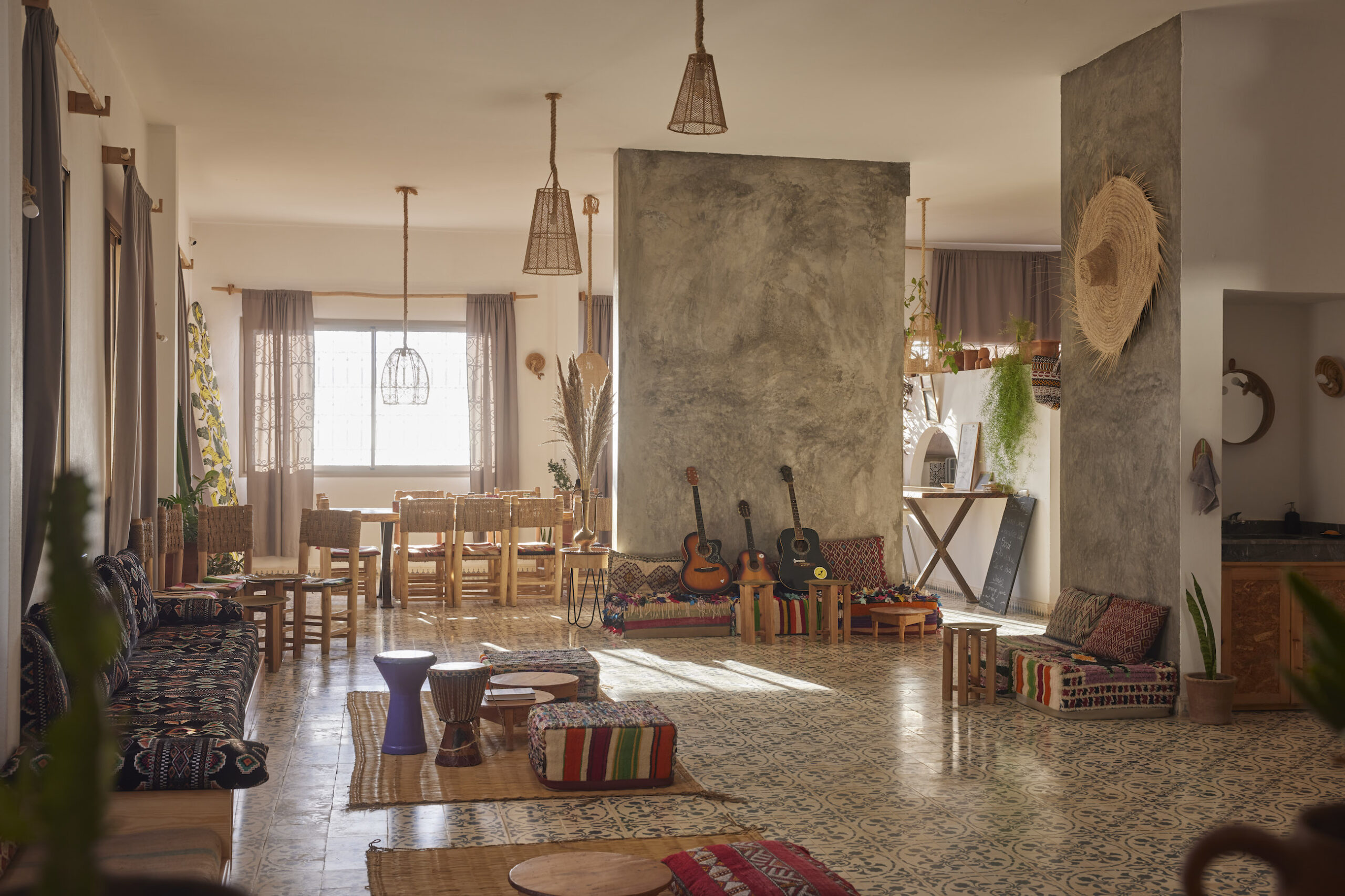Notre belle villa se situe dans la partie supérieure de Tamraght. Elle offre une vue superbe sur la côte – s’étendant du km 11 jusqu’à Taghazout. Au-delà de cette vue merveilleuse notre maison de Surf & Yoga dispose d’un magnifique toit – terrasse, d’une belle salle de Yoga dominant la mer au premier étage et d’un espace repas et lounge au rez-de-chaussée.